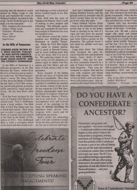 For twenty plus years Rick has written articles on occasion for the Civil War Courier and as of late for the Camp Chase Gazette. In the early days he wrote a series about Captain Tod Carter. Taking on a first-person impression, Rick told the story as if Tod were still living and writing under his pen name, The Mint Julep. Rick's second series was about General Leonidas Polk, and his legacy known as The University of the South. The institution was under a political attack to change its name, so Rick tried to sway public opinion in a positive manner with very informative articles about General Polk.
