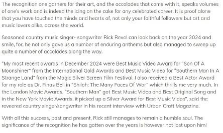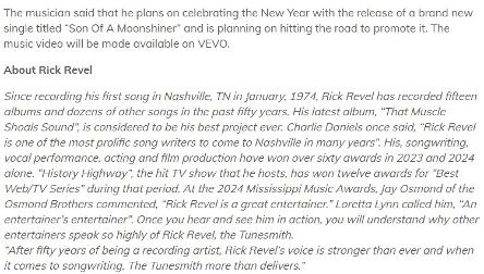 THAT MUSCLE SHOALS SOUND has a Lynyrd Skynyrd type of sound and you're bound to love. You can, actually, feel this song as the song goes on. There is no doubt you can get hooked on this song very easily. Check it out. I'd like to THANK RICK REVEL for being in touch. You can find him at: Deezer, Apple Music, Soundcloud, Spotify, Pandora, www.rickrevel.com and other sites. ROCK ON, JIM ALLFORD [STEEL NOTES MAGAZINE]