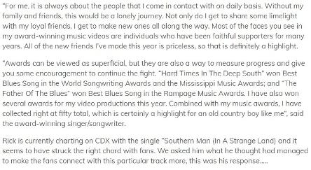 This a preview of Rick's latest EP: HARD TIMES IN THE DEEP SOUTH with some pure blues that will surely rattle your soul. The EP starts out with the title song that will surely have your rockin'. The song is so sweet as Rick plays the guitar as the harmonica is a real treat to hear. This song is surely a foot tapper and more. Crank it.up!